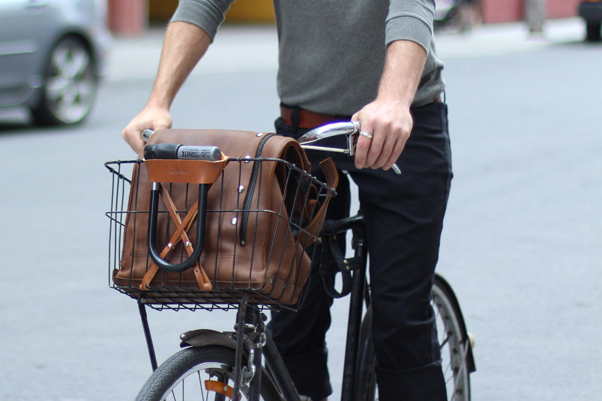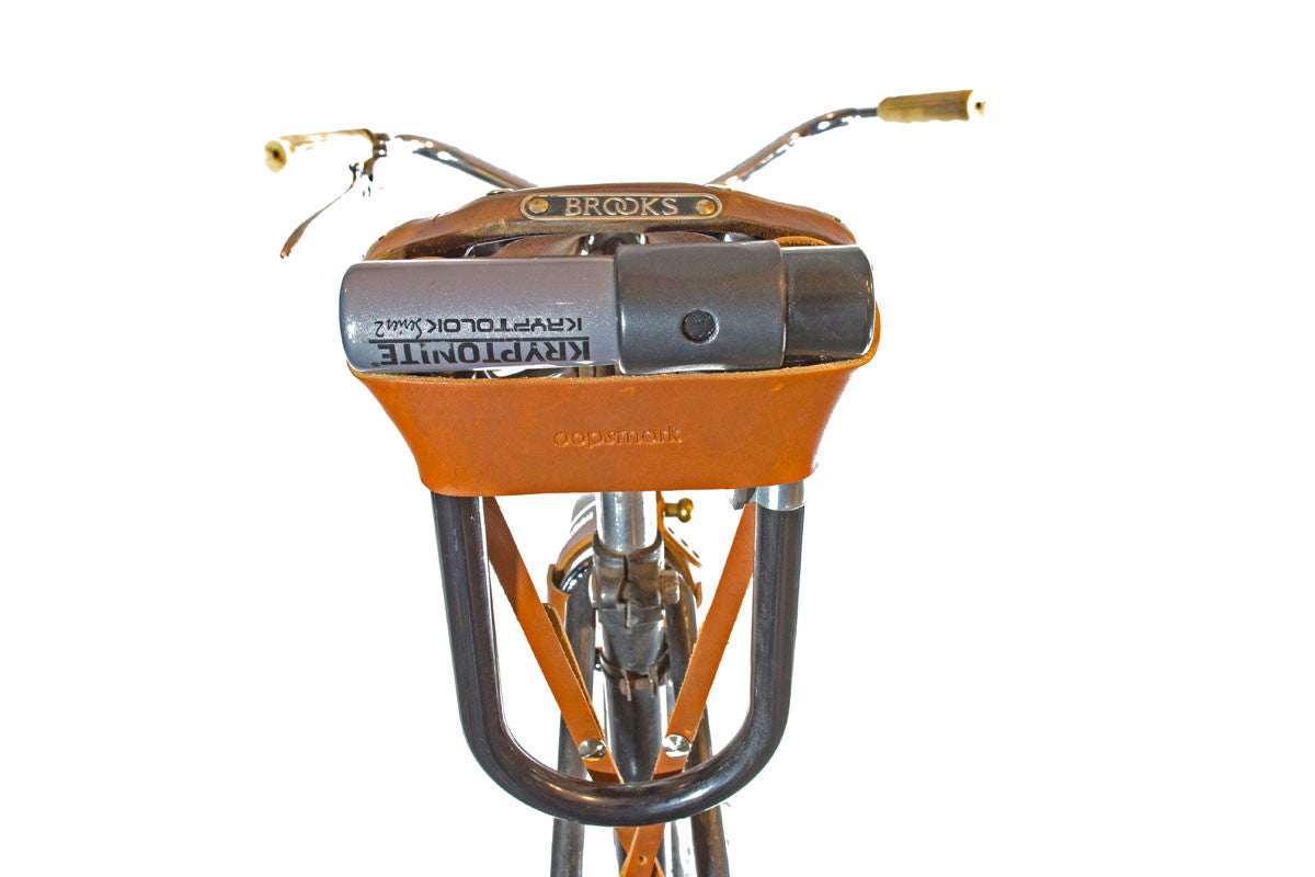 The U-Lock Holster is the solution to every cyclist's biggest biking problem: How to safely and securely carry a bike lock. This leather holster absorbs the shocks and vibrations of the road as you ride, holding your U-lock quietly and securely. Easily carry Kryptonite and other U-locks on the back of a saddle with tabs, a front or rear basket, or a rear pannier rack.