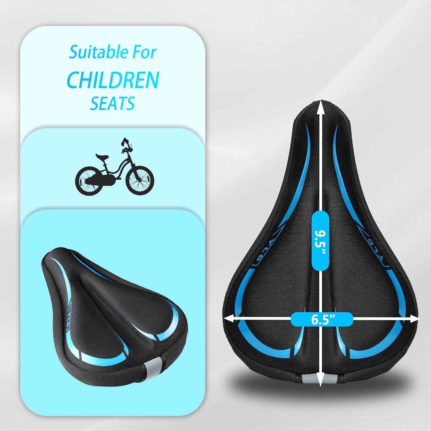 - 【Designed for Children】YLG kids Gel bike seat cushion is padded with breathable Gel material. The surface is made of stretchy Lycra material so as to help reduce muggy feelings and minimize pain caused by vibration. The 9.5"x 6.5" design makes the saddles fit snugly on most child bike seats, offering children the most comfortable riding experience and fun.
